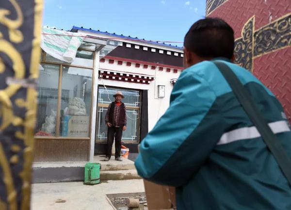 格桑次仁走進普瑪江塘鄉(xiāng)沙空村為一戶村民送郵包(7月27日攝)