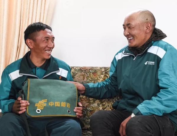 格桑次仁(左)抱著郵政挎包與次仁曲巴交談。交接工作時,次仁曲巴將他使用了6年的郵政工作包送給了格桑次仁(7月27日攝)