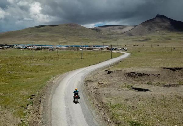 格桑次仁騎摩托車投遞郵件,經(jīng)過長途跋涉后海拔5500米的沙空村出現(xiàn)在前方(7月27日攝)