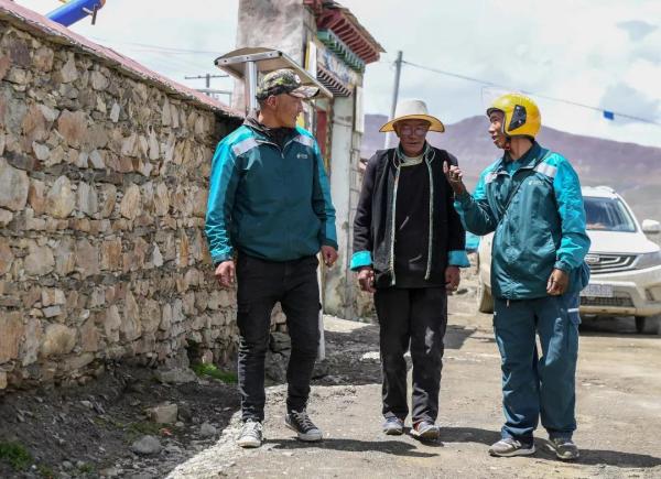 普瑪江塘鄉(xiāng)沙空村村民與前來投遞郵件的次仁曲巴(左二)和格桑次仁(左一)交談(7月27日攝)