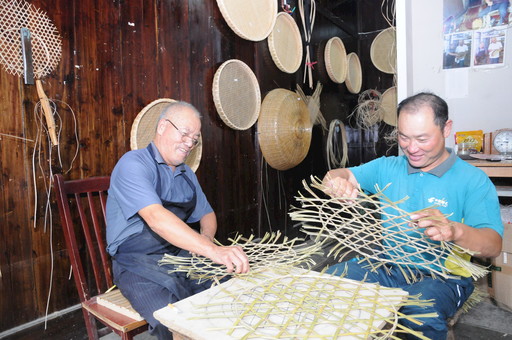 進入“非遺”文化館,王曉豐的話明顯多了起來:“父親的店以前在鎮東頭,搬到這兒也是近兩年的事兒。你們看這些大大小小的竹編制品,有果品盤、飯罩、魚簍等。我祖上就是做竹編的,父親從小就耳濡目染學習竹編。竹編從選竹、鋸竹、破竹到編織、刷磨,再到竹編成品,一套流程下來10多個步驟都是他親自完成,一個成品少則需要三五天,多則要幾個星期甚至一個月。”王曉豐搬了張小凳坐在父親身旁,“我平時工作忙,難得有空過來。”