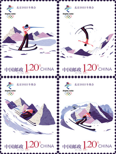 了解了雪上運動項目的特點之后,就要對4枚郵票主體內容進行篩選,準確地說,就是對4個運動項目動作姿態的選擇。比如冬季兩項由越野滑雪和射擊相結合,其中越野滑雪在第一枚郵票已有表現,所以只能用射擊場景代表。動作的確定還要考慮票形,運動員的圖形有時候是左右寬,有時候是上下高,4枚郵票是橫票還是豎票,最好都傾向于一致。同時,4枚郵票并排在一起,視覺上應該有前后連貫、空間互補的感覺。另外,4枚郵票中運動員的性別,我認為應該男女各兩枚為佳。總之,這是一個不斷糾結的過程,有些工作可能要反復調整好幾次。