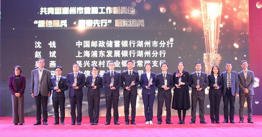 在浙江省湖州市金融系統近日舉辦的“建功新時代 金融青年說”演講比賽上,共青團湖州市委對湖州市“綠色金融青年先行”十大模范標兵進行了表彰,郵儲銀行湖州市分行的沈錢(左六)獲得此項榮譽。