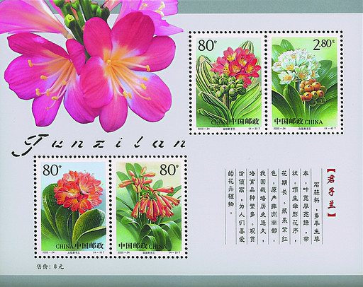 2000年12月12日,《君子蘭》特種郵票面世,小全張圖案為在淺灰色底襯托下,美麗的君子蘭栩栩如生,花的下方是一排精美的拼音文字鏤空設(shè)計,這種在版面上的鏤空設(shè)計在國內(nèi)尚屬首次。