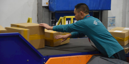 走進包裹處理場地,平時在上午略顯冷清的設備上,到處可見大大小小的包裹隨著機器皮帶流動著。在皮帶分揀機前,鮑光前遇到了一群身著紅馬甲的郵政人。“感謝各位黨員志愿者今天來中心局幫忙網運工作。這會兒皮帶分揀機缺少供件人員,5個人留在這兒,其余的和我一起去幫忙把剛送來的郵件拉到分揀區來。”說完,鮑光前又帶著大家往場地的另一端跑去。