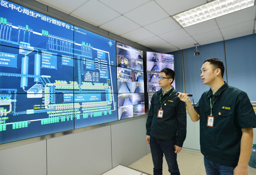 汪磊(右)與團隊成員一起了解生產管控平臺運行情況。