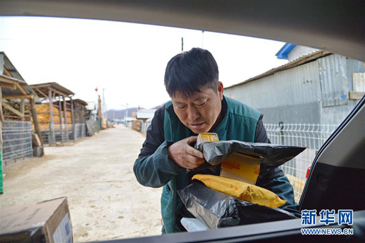 在琿春市春化鎮,金仁哲在搬運郵件。