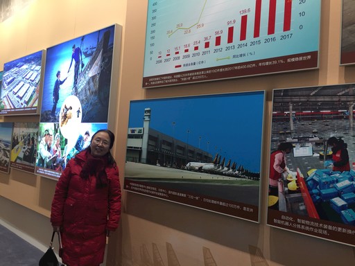 魏俊榮在“偉大的變革——慶祝改革開放40周年大型展覽”現場與她最驕傲的作品南集中心合影。朱曉忠 攝