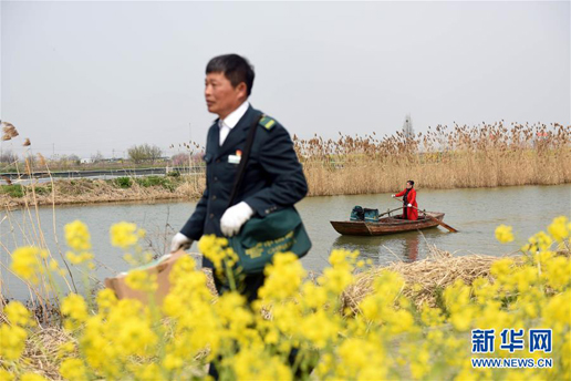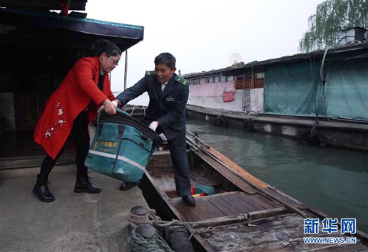 3月30日,唐真亞帶著郵包來到碼頭,準(zhǔn)備出發(fā)送郵件。 新華社記者 季春鵬 攝