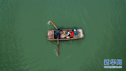 3月30日,唐真亞劃著小船和妻子閆玲前往新灘村送郵件(無人機拍攝)。新華社記者 季春鵬 攝