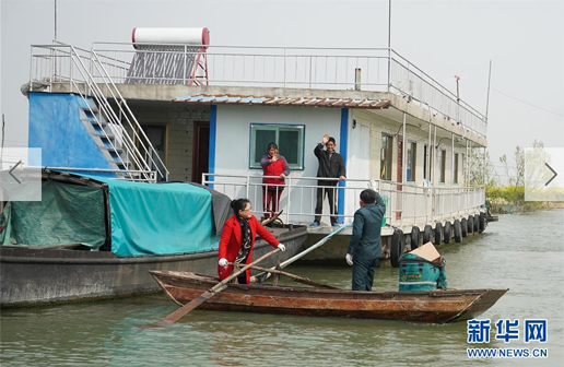 3月30日,唐真亞在新灘村上岸送郵件,妻子閆玲劃船跟隨。新華社記者 黃曉勇 攝