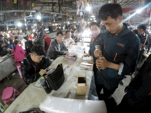 晚上10點,記者走進瑞麗市的姐告玉城夜市,這里燈火通明、人聲鼎沸,2500多個攤位前擠滿了全國各地慕名而來的玉石交易商、文玩收藏家及游客。不同店鋪、攤位前,主播們對著手機、打著手電,正忙碌地展示貨品,旁邊簇擁著等待出貨的商家,很多都是緬甸籍商人。直播中如有客戶線上下單,主播便快速將手中展示的貨品裝袋,用記號筆標注,再進行下一件貨品展示,最后,通過快遞將銷售的貨品寄出。