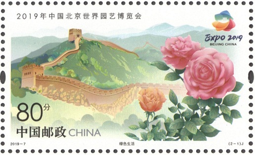 《2019年中國北京世界園藝博覽會》紀念郵票一套2枚,郵票圖案名稱分別為:綠色生活、美麗家園。郵票第一圖畫面以在青山間蜿蜒的長城、北京市市花——月季以及本次世園會的會徽——長城之花為主要元素,寓意園藝源于自然,倡導尊重自然、融入自然的理念,也突出了“中國風格”和“北京品牌”;郵票第二圖畫面以本次世園會國際館、中國館以及吉祥物“小萌芽”“小萌花”為主要元素,整體畫面生機盎然、朝氣蓬勃,啟示人們應當樹立綠色、低碳、環(huán)保的生產(chǎn)生活理念。