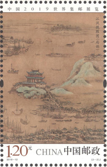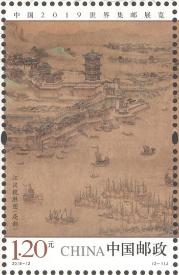 《江漢攬勝圖》是明代絹本國畫,國家一級文物,現藏于武漢博物館。畫面中心內容為長江、漢水交匯及水上船只通行景象,漢陽晴川閣與武昌黃鶴樓隔江相望。這幅畫集中表現了武漢最為重要的地理、人文風貌,體現武漢悠久歷史文化的同時,也飽含了世界郵展匯聚八方來客的喻義。