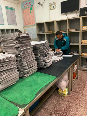 東四郵局北新橋投遞部已經分好的報紙(央廣記者 馮會玲攝)