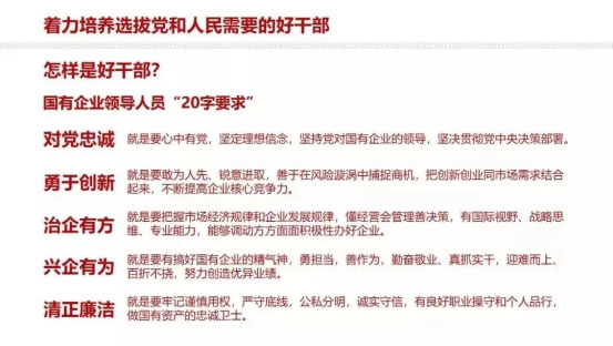 在全國國有企業黨的建設工作會議上,習近平總書記對國有企業領導人員提出了對黨忠誠、勇于創新、治企有方、興企有為、清正廉潔的“20字要求”。劉愛力在領學時表示,中國郵政將習近平總書記對國有企業領導人員的“20字要求”作為選拔干部、培養干部、考核干部的根本遵循,嚴格貫徹執行《黨政領導干部選拔任用工作條例》,堅持好干部標準,把政治標準放在第一位。