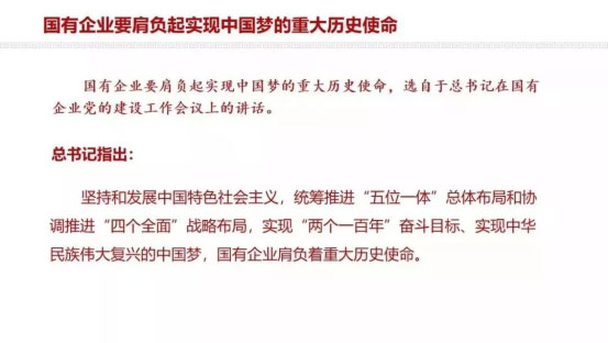 國有企業要成為黨執政興國的“六個力量”。國有企業要成為黨和國家最可信賴的依靠力量,成為堅決貫徹執行黨中央決策部署的重要力量,成為貫徹新發展理念、全面深化改革的重要力量,成為實施“走出去”戰略、“一帶一路”建設等重大戰略的重要力量,成為壯大綜合國力、促進經濟社會發展、保障和改善民生的重要力量,成為我們黨贏得具有許多新的歷史特點的偉大斗爭勝利的重要力量。