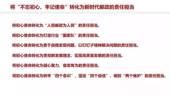 不忘初心再出發,牢記使命勇擔當。在舉國上下喜迎新中國成立70周年之際,集團公司黨組按照中央部署,以上率下,團結帶領各級黨組織和廣大黨員干部,樹牢“四個意識”、堅定“四個自信”、做到“兩個維護”,切實增強政治自覺、思想自覺、行動自覺,有力有序有效推進主題教育深入開展,將初心使命轉化為新時代郵政的責任擔當,做到學思用貫通、知信行統一,確保主題教育取得扎扎實實的成效,以主題教育的成效推動郵政改革發展、創新轉型取得新突破、邁上新臺階。