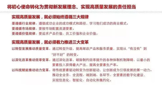 習近平總書記在“不忘初心、牢記使命”主題教育工作會議上深刻闡述了開展主題教育的重大意義、根本任務、目標要求和重點措施。廣大郵政黨員干部要進一步用習近平新時代中國特色社會主義思想武裝頭腦,指導實踐,緊扣郵政初心使命,緊密結合工作實際,將初心使命轉化為強烈的政治自覺、思想自覺和行動自覺,堅持質量第一、效益優先,推動企業高質量發展,把中國郵政打造成為行業“國家隊”。
