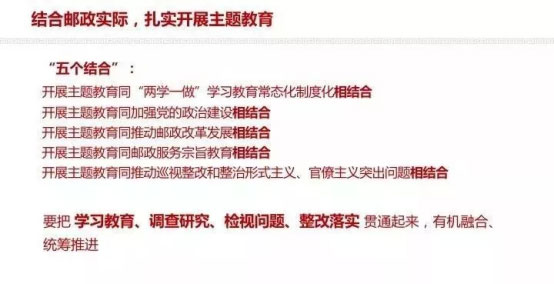 劉愛力提出,開展主題教育要做到“五個結合”:開展主題教育同“兩學一做”學習教育常態化制度化相結合,同加強黨的政治建設相結合,同推動郵政改革發展相結合,同郵政服務宗旨教育相結合,同推動巡視整改和整治形式主義、官僚主義突出問題相結合。他深入闡述了如何將學習教育、調查研究、檢視問題、整改落實貫通起來,有機融合,統籌推進。