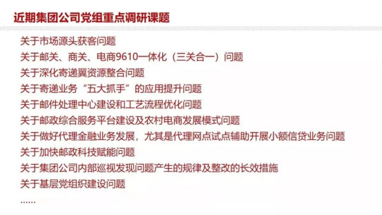 劉愛力強調,我們要通過解決重點問題求實效,從而全面貫徹落實習近平新時代中國特色社會主義思想。要堅持質量第一、效益優先,推動高質量發展;堅持問題導向,通過問題的不斷解決改進工作、推動發展;堅持推動互聯網、云計算、大數據、物聯網、人工智能和郵政業務深度融合,培育新增長點,形成新動能,推動新發展;堅持改革只有進行時,沒有完成時,永遠在路上;堅持求是求實的工作作風,撲下身子,走進基層,沉到一線;堅持以人民為中心的發展思想,牢記“人民郵政為人民”的服務宗旨,不斷滿足新時代人民群眾對美好用郵的新期待新要求。