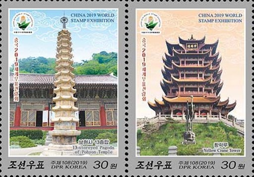 朝鮮為此次世界郵展發行郵票2種、郵資片1種,圖案選用兩國的古建筑——武漢黃鶴樓和平壤普賢寺古塔。朝鮮普賢寺建于1042年,13層古塔是普賢寺的鎮寺之寶,經歷風雨滄桑,底座部分白石變成了褐色(圖3)。