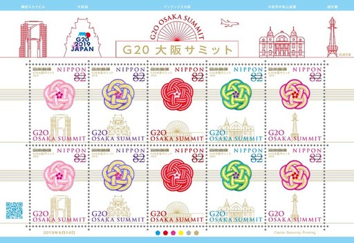 在第二季度中,最受全球關注的非在大阪舉行的二十國集團領導人峰會莫屬。日本為此發行了一套5枚郵票,圖案采用日本水引,為呼應主辦地大阪,郵票圖案的水引為梅花造型(圖5)。水引是日本儀式禮品上的繩結,代表結緣或是召喚幸福。郵票下方5個大阪地標,包括梅田藍天大廈、大阪城、大阪國際會展中心、大阪市中央公會堂、通天閣。此次峰會標志以富士山為設計主題,富士山的“山頂”和“朝日”象征著全球經濟增長和繁榮。在富士山的下面,盛開的櫻花象征著春天的到來,也預示著全球經濟的美好未來。