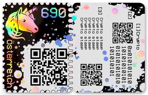 奧地利于6月11日發行世界首枚區塊鏈(加密貨幣)郵票(圖6)。該枚郵票不僅可以作為普通郵票使用,也可以與加密貨幣一樣作為數字資產儲存在數字錢包中永久收藏。郵票設計融合了郵票和自動化識別碼,左側包含獨角獸圖案和二維碼,右側包含以太坊區塊鏈錢包持有人訪問代碼和另一附加碼,可以通過以太坊錢包轉讓或轉移,每一次交易都會被永久記錄在區塊鏈中。