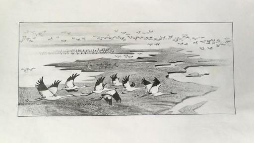 “這枚郵票是整套郵票中創(chuàng)作設(shè)計(jì)難度最大,也是修改次數(shù)最多的。”楊老師介紹,起先并不清楚東方白鸛與白鶴的差別,經(jīng)過專家的詳盡介紹才了解到,白鶴飛時翅膀是展開的、有些分散,而白鸛飛時翅膀仍然比較整齊。在后期修改時,白鸛的特寫和造型單獨(dú)畫了好幾次,再借用電腦進(jìn)行合成處理。山與水、湖與江、鳥與草,為了前后照應(yīng),楊老師在該枚郵票上運(yùn)用了一些西洋手法,實(shí)現(xiàn)了中西合璧。