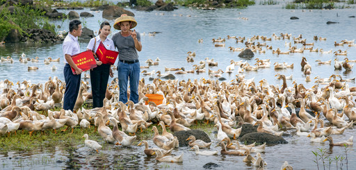 圖為海南省臨高縣新盈鎮養鴨農戶張建軍(右)在郵儲銀行家庭農場貸款的支持下,養鴨數量超過一萬只,預計今年收入可觀。 □符德勇 攝影報道