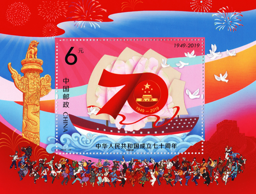 在慶祝新中國成立70周年之際,中國郵政發行《中華人民共和國成立七十周年》紀念郵票,展示祖國在經濟、政治、文化、社會、生態文明等方面取得的巨大成就。