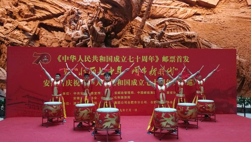 10月1日15時,由中共安徽省委宣傳部、安徽省郵政管理局、安徽省郵政分公司、安徽省集郵協會、合肥市文化和旅游局主辦的《中華人民共和國成立七十周年》紀念郵票首發暨“壯麗七十年 闊步新時代”集郵巡展在渡江戰役紀念館舉行?;顒又?,安徽省分公司帶來了快閃表演《我和我的祖國》,全場同唱贊歌,歌頌祖國。圖為合肥市郵政分公司員工帶來的《鼓舞盛世 揚帆遠航》表演,強勁有力的鼓聲表達了慶祝新中國成立70周年的喜悅之情。(徐吉波 攝影報道)