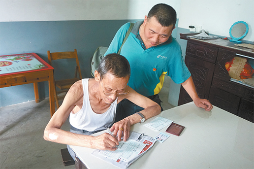 劉彩陸指導鐘福爐老人填寫取款單。