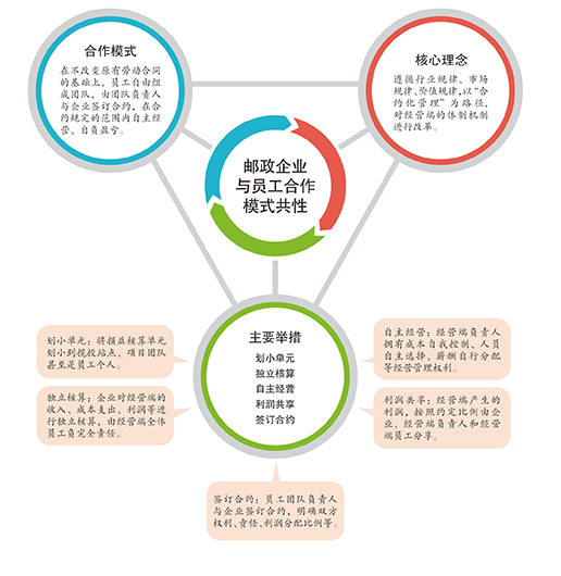 浙江義烏郵政的“準加盟”制、云南郵政的“創客計劃”、山東郵政的“合伙人”制以及湖南郵政的“眾創眾享工程”,盡管模式千差萬別,但原理大同小異,若從方法論的角度探究,離不開基于“合約”之上的資源配置,主要體現在:劃小經營核算單元與所有權分配思想的建立;內部市場化與經營責任單元的利益分配;利益共同體的形成與體制機制改革的真正落地。