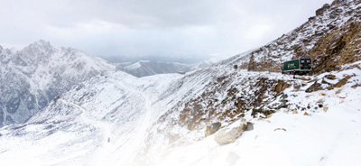 那天大雪,生龍降措開著滿載的郵車從甘孜去德格。雀兒山最險(xiǎn)最陡的路段有三十多米,卡車只有掛一擋才爬得上去;而且因?yàn)闃O窄,一次僅容一輛車通過。就在生龍降措的車進(jìn)入這段路時(shí),突然下面一輛卡車迎面駛來,車上滿滿當(dāng)當(dāng)載著人!冰道上,兩車距離越來越近,近得可以看清對面車上乘客驚恐的臉。