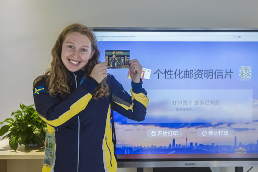 外國運動員展示剛剛打印的個性化明信片。