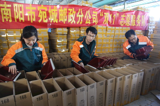 11月11日上午,河南省南陽市宛城區(qū)郵政分公司組織黨員突擊隊深入電商園區(qū),為大客戶提供包裝、收寄、運輸?shù)确眨M一步提升客戶體驗。 □劉力揚 攝影報道