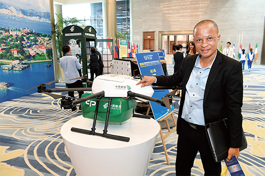 現(xiàn)場(chǎng)展示的郵政無(wú)人機(jī)和無(wú)人投遞車。