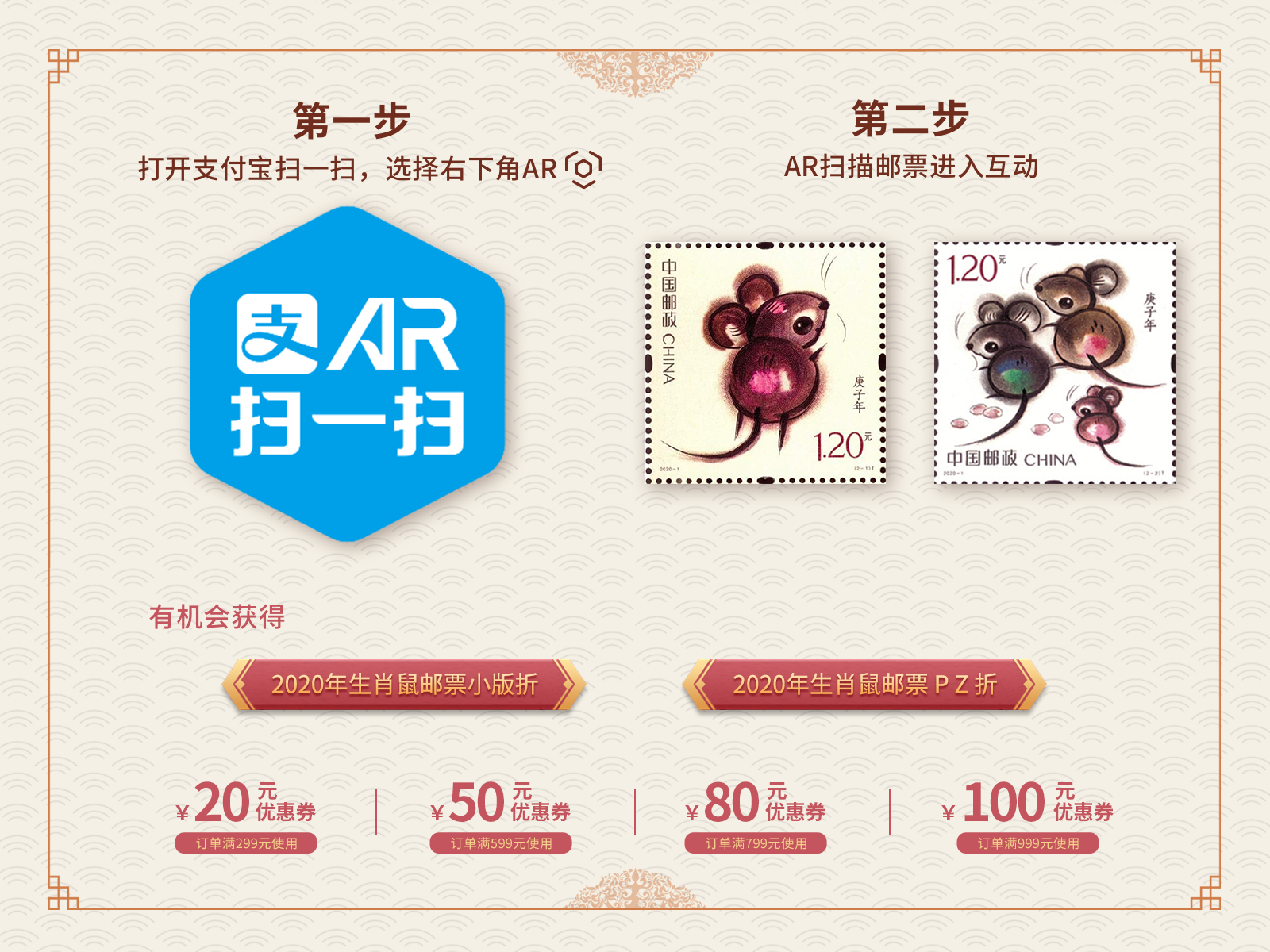 2020年是庚子年,也是我國生肖郵票發行40年。今年的《庚子年》鼠年生肖郵票,除了郵票本身,還帶來了非常多的趣味玩法,包括:看AR與生肖鼠互動、DIY鼠年郵票送祝福、尋找奇妙博物館里的新年禮物、看直播抽大獎。讓我們一一揭曉。