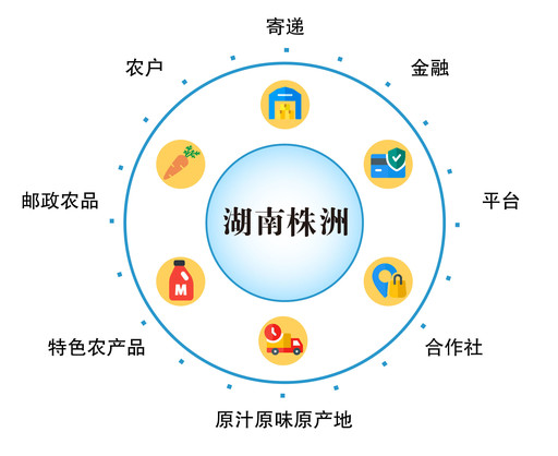 圍繞特色農產品,堅持“原汁原味原產地”的價值主張,構建“基地+合作社+農戶+平臺+金融+寄遞”的服務模式,拓展前方市場、建設后方基地、夯實中間保障,打造“郵政農品”品牌。這一生態(tài)模式在湖南株洲得到了最佳實踐。