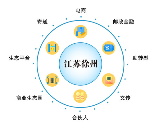 正如徐州郵政云郵眾創(chuàng)基地的案例一樣,各地郵政都在積極構建自身協(xié)同體系,探索郵政特色商業(yè)生態(tài)圈發(fā)展模式。在河南新鄉(xiāng),郵政客戶的積分不僅可以用來支付郵費、購買簡易險、農資、個性化郵票、兌換郵政電商產品,還可以用來加油、給孩子訂閱教材等;在湖南株洲,與郵政合作,就相當于跟整個黃桃電商產業(yè)鏈合作;在江蘇徐州,郵政電商客戶可以獲得郵政電商孵化基地提供的“金融+寄遞+文創(chuàng)+電商+第三方服務+政府引導”等一攬子電商綜合服務。