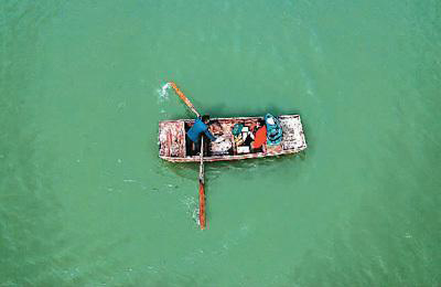 江蘇省淮安市洪澤區(qū)老子山鎮(zhèn)郵遞員唐真亞劃著小船和妻子閆玲前往新灘村送郵件。新華社記者 季春鵬攝