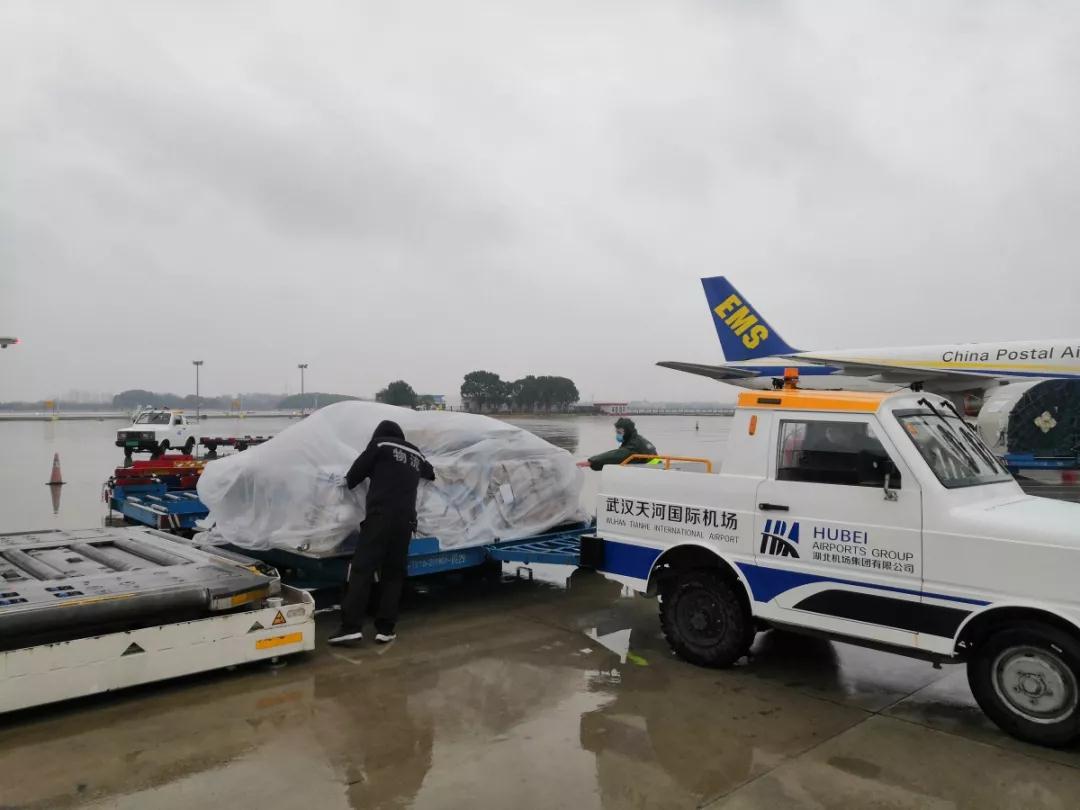 隨著飛機先后抵達,武漢天河機場接卸作業(yè)迅速展開。由于下著小雨,郵航武漢辦事處人員在物資的機坪盤運中,緊急加蓋塑料布,防止物資被雨淋濕。通過緊張的作業(yè),郵航武漢辦事處均在半小時內(nèi)先后將兩架專機運抵物資移交陸側(cè)作業(yè),現(xiàn)該批物資正由武漢郵政迅速運往接收方。