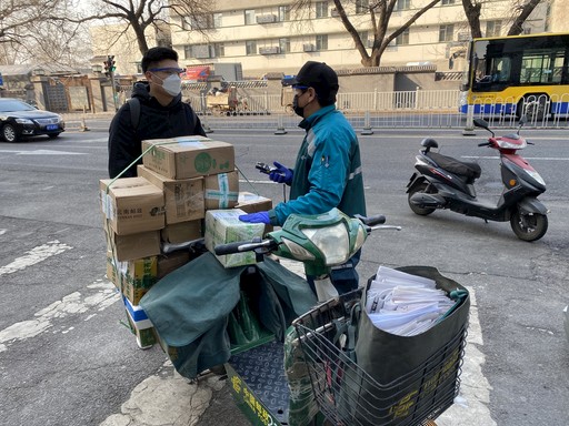 2月19日9點半,寒風中,東四郵局北新橋投遞部投遞員張志福戴著護目鏡、口罩、一次性手套,站在某小區門口,一個接一個地撥通收件人的電話,等待他們來領取包裹。11天前,這個小區出現一例新冠肺炎確診病例。從那時開始,附近的居民都繞著這個小區走。