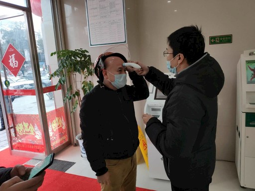 武穴市刊江路支行工作人員為客戶測(cè)量體溫。