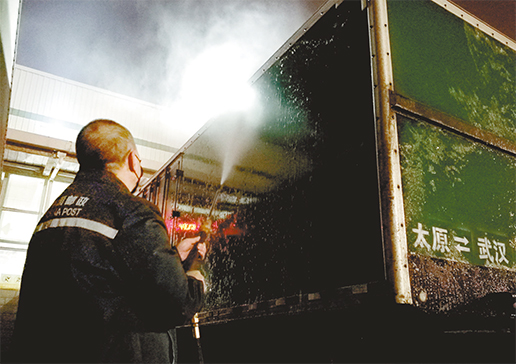 山西省太原郵區中心局員工為武漢返程郵車噴灑消毒液。 武亞亮 攝