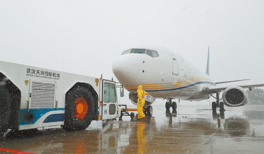 郵航直飛航班滿載防疫物資頂風冒雪抵達武漢天河機場。 楊衛東 提供