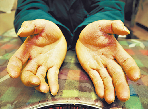 總幫客戶拆快遞包裝,加上天氣多風、投遞量大,貴州省都勻市郵政分公司攬投員彭光徳雙手干裂發黃。 聶悠瑞 攝