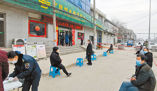 山東菏澤郵政農村支局在營業廳外設立等待專區,客戶測量體溫并消毒后方可進入廳堂辦理業務。 李慶昌 提供