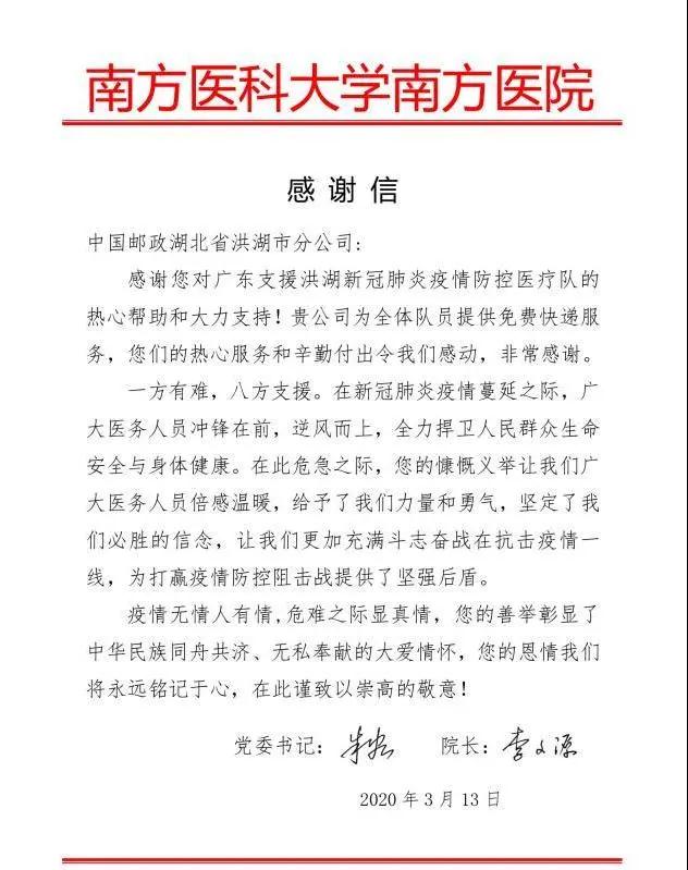 “感謝您對廣東支援洪湖新冠肺炎疫情防控醫療隊的熱心幫助和大力支持!貴公司為全體隊員提供免費快遞服務,您們的熱心服務和辛勤付出令我們感動,非常感謝。”3月13日,湖北省洪湖市郵政分公司收到了來自南方醫科大學南方醫院發來的感謝信,近日,他們為廣東援鄂醫療隊隊員們免費收寄了個人物資254件,讓醫療隊隊員們能夠輕松平安回家。
